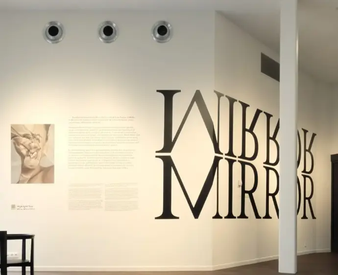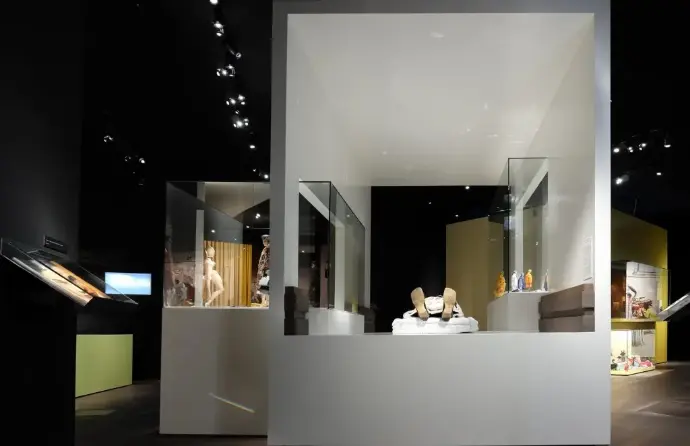 Solution bouwde volledig zelf de tentoonstelling van het MoMu. Er werd gebruik gemaakt van gordijnen, sokkels, constructies met glazen wanden, bestickering, lichtbakken